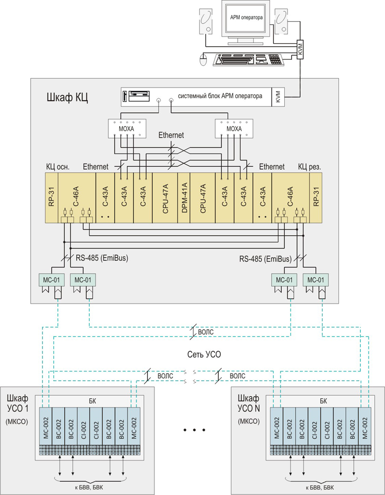 КЦ, имеющий в своем составе 4-х канальный сетевой модуль С-46А, опрашивает блоки БК, установленные в каждом шкафу УСО. Протокол передачи данных - EmiBus, скорость передачи данных - 1,8 Мбит/с.