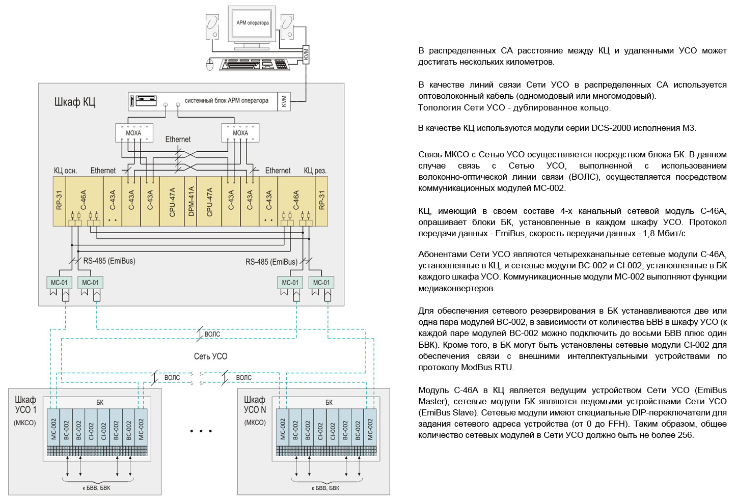 Сеть УСО реализована посредством интерфейса RS-485. Сетевой модуль С-46А в КЦ подключается экранированной витой парой непосредственно к клеммникам БК, БВВ и БВК. При этом поддерживается топология Сети УСО - дублированная магистраль. |