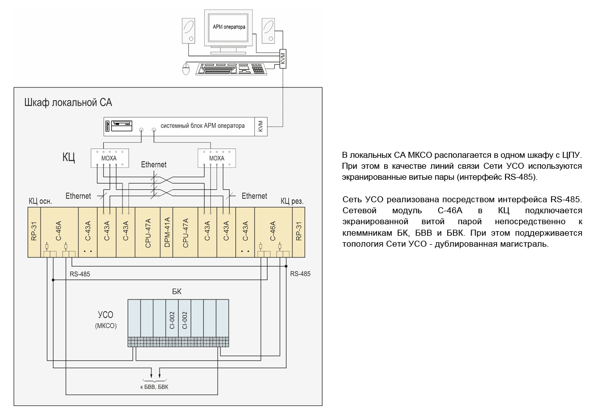 В локальных СА МКСО располагается в одном шкафу с ЦПУ. При этом в качестве линий связи Сети УСО используются экранированные витые пары (интерфейс RS-485).