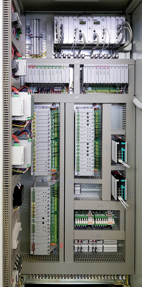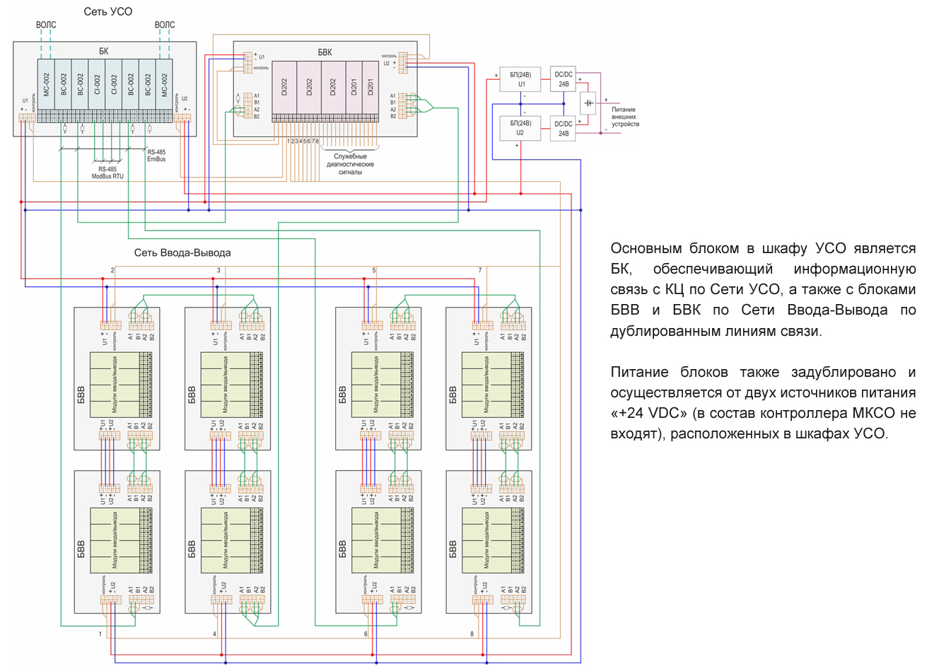 Питание блоков также задублировано и осуществляется от двух источников питания «+24 VDC» (в состав контроллера МКСО не входят), расположенных в шкафах УСО. |